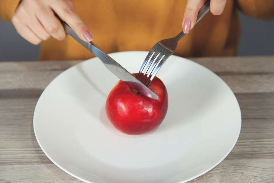 Une femme coupe une pomme rouge avec couteau et fourchette sur une assiette blanche, symbole de manger sainement.